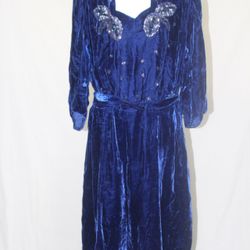 Rare Plus Size 1930s Royal Blue Silk Velvet dress with sequin detail and matching belt$375Juniper Hills, CA
