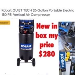 Brand new in box Kobalt QUIET TECH 26-Gallon Portable Electric 150 PSI Vertical Air Compressor $280 cash only East Palmdale Address will be provided$280Palmdale, CA