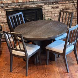 Brown Farmhouse Wood Round 48” Round Pedestal Dining Table with 4 Side Chairs with Beige Upholstery $1,000San Jose, CA