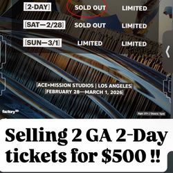 2 Festival Tickets And Premier Parking Pass$1,200Santa Ana, CA