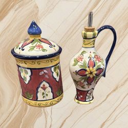PIER 1 VALLARTA JAR /CANISTER W/LID .OIL/VINEGAR JAR BOTTLE DRIZZLE POUR SPOUT. SET OF 2. HAND PAINTED.$40Santa Ana, CA