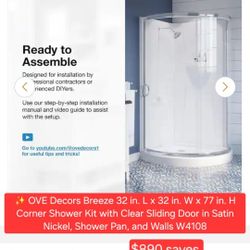 ✨️ OVE Decors Breeze 32 in. L x 32 in. W x 77 in. H Corner Shower Kit with Clear Sliding Door in Satin Nickel, Shower Pan, and Walls W4108$890Los Angeles, CA