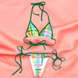 Blackbough Color Block Party Neon Plaid Bikini Set w Emerald Green Ties with Triangle Top with Inserted Cups | Women’s Size Small$30Los Angeles, CA