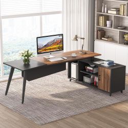 79 in. L-Shaped Brown Wood Computer Desk with File Cabinet, Large Executive Office Desk with Shelves, Business$180San Gabriel, CA