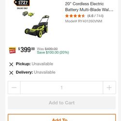 RYOBI 40V HP Brushless 20 in. Cordless Battery Walk Behind Push Lawn Mower with 6.0 Ah Battery and Charger$170Gardena, CA