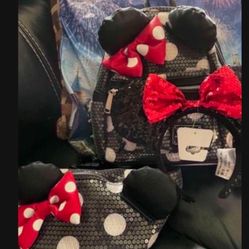 Disney Parks Black Sequin Polka Dot Mini Backpack, Disney Parks Loungefly Sequin waist bag Fanny Pack Minnie With Ears Polka Dot and Disney Parks Ear $200Montebello, CA