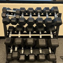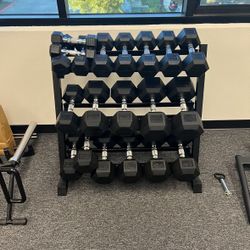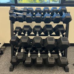 (New In Box) 5-50lb Rubber Hex Dumbbells With 3 Tier Dumbbell Rack Weights - Click On Out Profile For More Gym Equipment Via $800Pomona, CA
