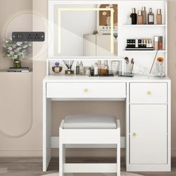 White Vanity Desk Set with LED Light Mirror & Power Outlet, Makeup Table with 3 Shelves & 2 Drawers & 3 Level Adjustable Cabinet & Makeup Vanity Stool$75Irwindale, CA