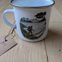 Los Torres Patagonia Chile Camping 14 Oz Metal Enameled Coffee Mug. Swing Bridge