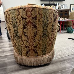 Vintage Swivel Lounge Chairs Pair Damask Fabric Carved Wood Arms Tassel Fringe $600Los Angeles, CA