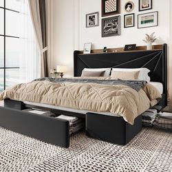 King Size Bed Frame with 3 Drawers, USB & Type-C Charging Ports, Velvet Upholstered Platform Bed with Modern Geometric Wingback Storage Hea$180Ontario, CA