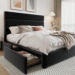B346 $145 Modern Queen Size Platform Bed Frame with 4 Storage Drawers and Velvet Upholstered Headboard, Wooden Slats Support, Upholstered Mattress Fo$145Jurupa Valley, CA