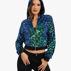 Small Sparkly Cropped Sequin Jacket Hooded Long Sleeve Zip Up Glitter Bomber Jacket Party Club$25Fontana, CA