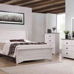 A Distressed White Finish Farmhouse Style Solid Wood Bed Boxspring Needed Available In Queen $560 And Cal King $620 Financing Available $560Moreno Valley, CA