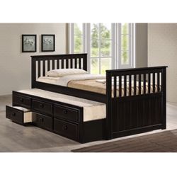 Espresso Twin Over Twin Wooden Platform Bed With Trundle And Storage Drawers Fully Slated No Bunkie Board Needed Brand New In Box Firm Price $360$360Riverside, CA