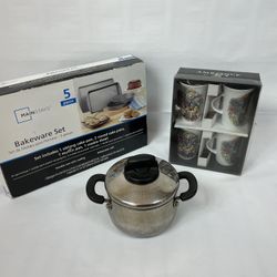 -New main stream baking pan set. -New 4 coffee cups it. -Used stainless steel pot with Straining top. $12Moreno Valley, CA