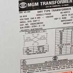 25 KVA 1 Phase Transformer 480/240,/120$750Norwalk, CA