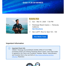 Kolohe Kai concert ticket at Pechanga$200Los Angeles, CA
