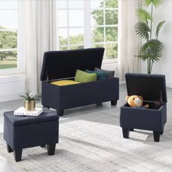 3Pcs Dark Blue Fabric Large Storage Ottoman Bench Set, Line Bedroom End of Bed Storage Bench with 2 Ottoman Footrest$110Hacienda Heights, CA
