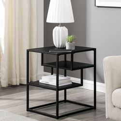 Walker Edison Contemporary Wood and Metal Tiered Side Table, featuring a black powder-coated steel frame and warp-resistant MDF wood shelving. ®$40Los Angeles, CA