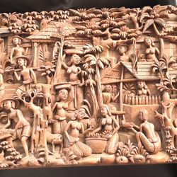 Hand Carved Wood Village Scene Wall Panel Relief Folk Art Boho Decor 34"$225Redwood City, CA