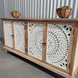 New Modern Farmhouse Carved Wood Sideboard Cabinet, White Mandala Carved Doors, Solid Wood Storage Credenza for Living Room, Dining Room or Entryway, $180La Mirada, CA