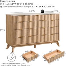 Modern Fluted 9 Drawers Dresser, Chest of Drawers, 54" Wide Dresser TV Stand with Curved Profile Design/Gold Accents, Wood Drawer Organizer $120Ontario, CA