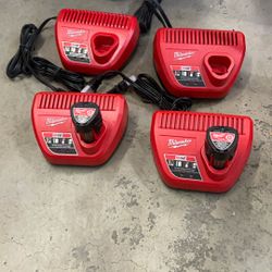 (4) New Milwaukee M12 chargers and (2) 2.0 Batteries$200La Verne, CA