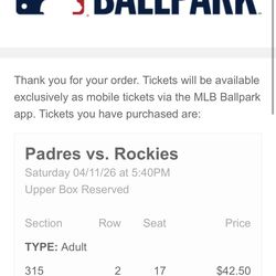 Padres Vs Rockies THURSDAY 4/9$65San Diego, CA