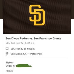 2 Padres Tickets Saturday 03/30 100$ $100San Diego, CA