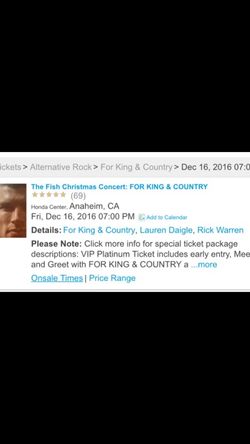 2 tickets for Lauren Daigle concert in Anaheim for Dec 16$50Chula Vista, CA