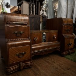 Vintage Antique Waterfall Dresser Vanity Nightstand Set Bedroom Furniture Carved Wood Inlay Mirror$750San Diego, CA