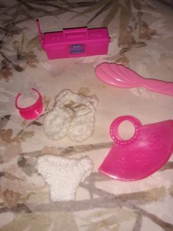 6 piece Beach Set - including 2 piece Croquet Bikini, Beach Tote, Visor, Boombox & hairbrush. From the late 90s. For Barbie.$5El Cajon, CA