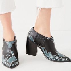 Urban outfitters Jameson blue black faux snake skin skin retro chunky heel pointed toe boots ankle boots booties One mark shown on left inside Siz$40San Diego, CA