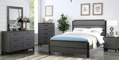 Brand new grey finish 4PCs queen bedroom set (queen frame, dresser, mirror, nightstand)$999San Diego, CA