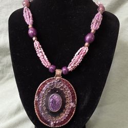 Vintage Tribal Boho Statement Necklace – Purple Beaded Multi-Strand with Large Ornate Pendant – Ethnic Artisan Style