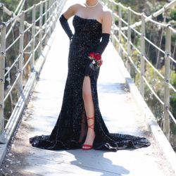 Daisda Stunning Black Sequins Sleeveless Strapless Split Long Prom Dress with Ruffles$200San Diego, CA