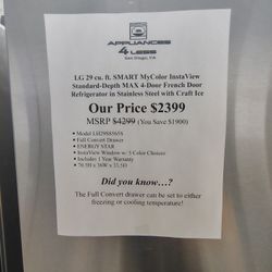 $1289 LG 27 Cu Ft SMART Counter Depth MAX French Door Refrigerator, Financing Available$1,289Lemon Grove, CA