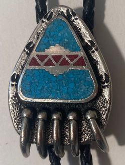 Vintage Metal Bolo Tie, Bear Claw, Native, Nice Silver with Nice Red and Blue Crushed Turquoise Stones Design, Nice Western $125Lakeside, CA