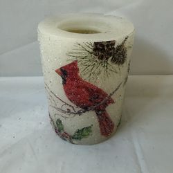Decorative White Glittery Pillar Candle with a Red Cardinal, Pinecones and Holly$5Roseville, CA