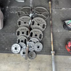 Olympic weights 255lbs total plus 7ft 45lbs bar and curl bar$280Moreno Valley, CA
