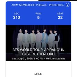 BTS World Tour 'ARIRANG' In Los Angeles Sofi Stadium Tuesday September 1, 2025. 4 Tickets Available$400West Covina, CA