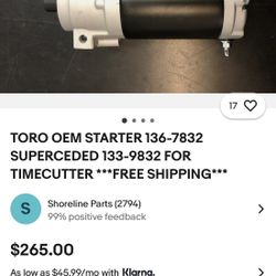TORO OEM STARTER 136-7832 SUPERCEDED 133-9832 FOR TIMECUTTER$100Chino, CA