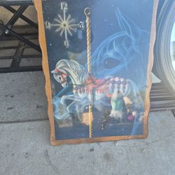 a vintage Sue Dawe carousel horse wall clock from the 1980s, featuring a fantasy art design often found on souvenirs and home decor from that era.$10Hesperia, CA
