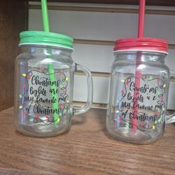 Christmas-themed glass mason jar tumblers featuring holiday lettering, lids, and straws. $5Hesperia, CA