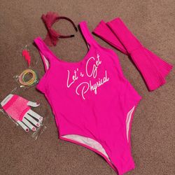 New Medium Hot Neon Pink 80s Bathing suit Swimsuit One Piece Bodysuit Costume Accessories $20Mount Baldy, CA