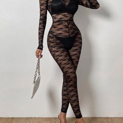 Medium Sheer Lace Long Sleeve Mock Neck Bodycon Jumpsuit Unitard Bodysuit$20Rialto, CA