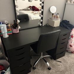 Large Vanity Desk with Open Mirror and Glass Tabletop, Vanity Desk with Mirror and Lights, Drawers and Shelves, Crystal Handles, Cushion Stool not Inc$160Upland, CA