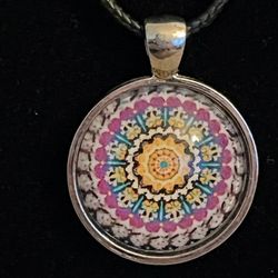 Purple, blue, and Yellow Mandala Mosaic Pendant on a Soft Black Cotton$8Rialto, CA