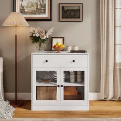 31.5W Kitchen Credenza & Sideboard,Buffet Cabinet with Drawer & 2 Glass Doors,Coffee Bar for Dining Room,White$100Rialto, CA